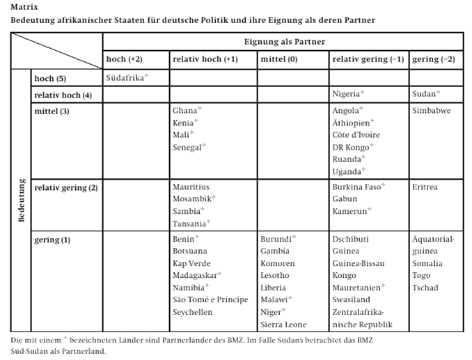 Die Tabelle »Partner und Störer« (Originalton) stammt aus einer Studie der Stiftung Wissenschaft und Politik vom März 2009.7 Sie stellt »Bedeutung afrikanischer Staaten für deutsche Politik und ihre Eignung als deren Partner« fest. Es wird unterschieden zwischen Staaten, die eine große Bedeutung haben – sie werden mit fünf Punkten bewertet –, und Staaten mit einer geringen Bedeutung – sie erhalten einen Punkt. Es gibt Staaten mit einer hohen Eignung als Partner von +2, Staaten mit einer mittleren Bewertung und Staaten mit einer niedrigen Bewertung bis zu -2. Länder mit einer relativ hohen Bedeutung sind zum Beispiel Nigeria und der Sudan. Dennoch ist der Sudan laut Stiftung Wissenschaft und Politik überhaupt nicht als Partner geeignet, das hat sich ja auch schon in der deutschen Politik gezeigt. Auch Nigeria wird hier relativ negativ eingestuft. Wahrscheinlich wird darauf angespielt, dass die nigerianische Regierung sich nicht wirklich von außen kontrollieren lässt, jedenfalls im Moment nicht von Deutschland aus. Die Skala kennt nur einen Staat, der eine hohe Bedeutung hat und gleichzeitig als Partner sehr geeignet ist, und das ist Südafrika.