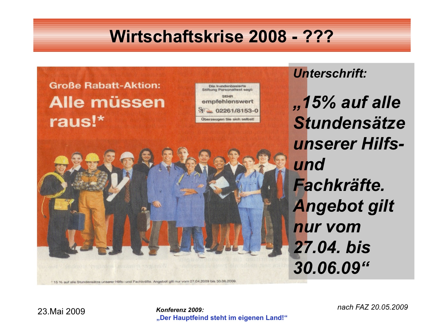 Ich habe eine Anzeige mitgebracht von einer süddeutschen Zeitarbeitsfirma vom April 2009: »15% auf alle Stundensätze unserer Hilfs- und Fachkräfte. Angebot gilt nur vom 27.04. bis 30.06.09« – zu lesen in der FAZ vom 20.5.2009.
