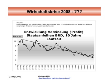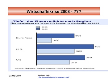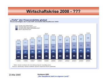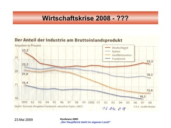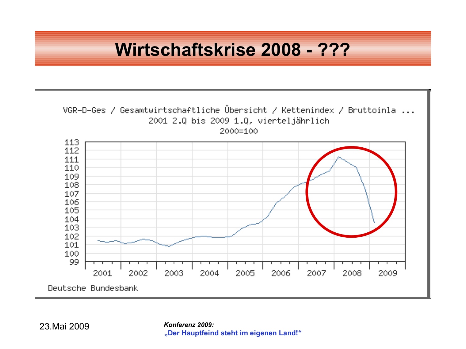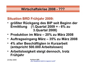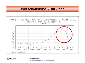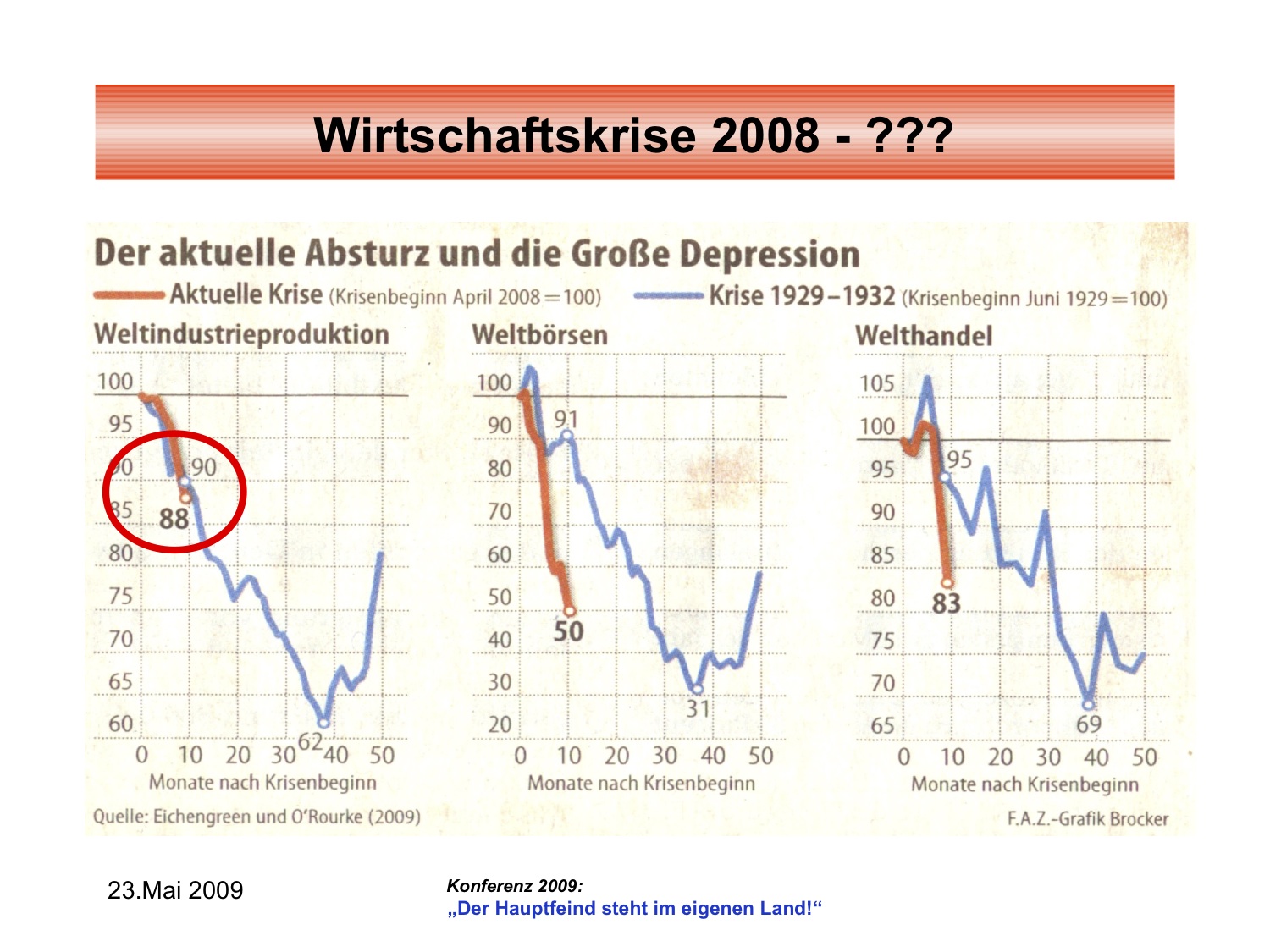In den Jahr seit dieser genannten Analyse ist viel passiert. Vor einem Jahr standen wir vor einer ganz anderen Situation. Im September erschütterte die Pleite der Lehmann Brothers weltweit die Ökonomie. Danach überschlugen sich die Ereignisse. Mittlerweile haben wir die verschiedenen Rettungspakete, die es gibt; Verstaatlichung und Teilverstaatlichung von Commerzbank, Hypo Real Estate (die vorher in der Runde auch nicht jeder kannte, weil sie nicht weiter präsent ist in Form von Filialen) und so Manches mehr. Opel – die Situation ist auch noch ungeklärt, aber heftig in Bewegung. Das sind alles Dinge, die noch kein Jahr her sind, und sie stellen uns vor eine verschärfte Situation. Auf den Vergleich mit 1929 komme ich gleich noch.