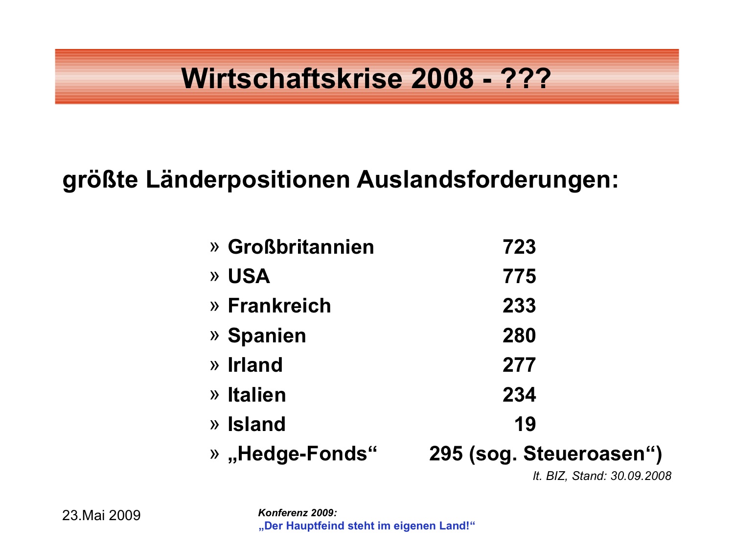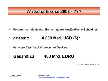 Das ging über mehrere Jahre. Hier ist der Stand vom 30.09.2008 laut Bank für internationalen Zahlungsausgleich (BIZ), einer Institution, die in keiner Weise politisch links steht. Diese hat ermittelt: 4,3 Bio. $ waren die Forderungen aller deutschen Banken zusammen gegen Schuldner im Ausland, weit mehr als das gesamte Bruttoinlandsprodukt eines gesamten Jahres, müsste sogar mehr als zwei Jahre sein. Und das bezieht sich nur auf den Bereich der ausländischen Schuldner. Es gibt natürlich noch anderes Finanzvermögen, das dem deutschen Imperialismus zuzurechnen ist. Im Vergleich dazu: das Eigenkapital aller deutschen Banken insgesamt beträgt 400 Millionen (vor der Krise). Die deutschen Banken haben massiv Kapital ausgeliehen. Wohin?