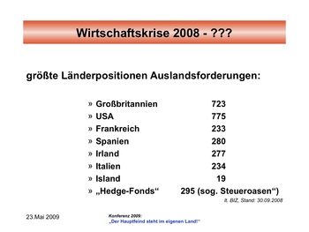 Die USA ist der größte Schuldner weltweit insgesamt, wie ihr sicher wisst. Darauf baut auch ein Teil dieser antiamerikanischen Propaganda auf: Die saugen sozusagen das ganze Geld der Welt auf und geben es aus – ungeheuerlich und überhaupt … China ist in der Tat der größte Gläubiger der USA, da haben wir schon eine Konstellation, die etwas komplizierter ist. Wir betrachten aber die deutschen Banken. Zum Beispiel auch in Island sind die deutschen Banken die größten Gläubiger. Da sind es zwar nur 19 Milliarden gewesen (von insgesamt etwas über 70), allerdings für einen Staat mit 200.000 Einwohnern doch eine ganze Menge.