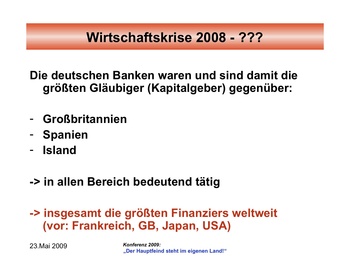 Die deutschen Banken sind die größten Gläubiger von Großbritannien, Spanien, Island. In allen Bereichen waren sie überdies bedeutend tätig. Bei Weitem waren nicht nur diese Hypothekenkredite in den USA das Thema, sondern sie haben wirklich versucht, auf der ganzen Welt ihren Kapitalexport zu tätigen. Sie waren damit insgesamt in Summe die größten Finanzierer weltweit. Mehr als Frankreich, mehr als das Finanzkapital von Großbritannien, Japan – über alle Bereiche weltweit verteilt.