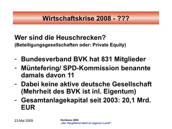 Müntefering hätte vielleicht recht, wenn er betonen wollte, dass sich der durchschnittliche Kapitalist nicht viel Sorgen macht über die Lage seiner Arbeiter. Soweit kann man nicht widersprechen. Was dann im Weiteren kommt mit diesen »Heuschrecken«, mit diesen Vergleichsbildern … Dazu kommt noch, was die zugehörige SPD-Kommission daraus gemacht hat: ganz explizit 11 Firmen rauszusuchen. Dies sind sogenannte Beteiligungsfirmen, Firmen, die Kapital einsammeln oder sich leihen und dann Firmen aufkaufen mit dem Ziel, nach einiger Zeit diese wieder mit Profit zu verkaufen. Dabei kaufen sie zum Teil – sozusagen als eine Seite dieses Geschäftsmodells – Firmen, die vor der Pleite stehen oder pleite sind und wälzen diese einmal durch, versuchen dann, profitable Teile zu erhalten, andere werden geschlossen usw. Das trägt dann zu dieser extrem negativen Sicht auf das, was sie tun, bei.