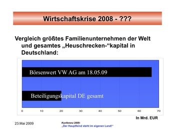 Wir haben hier das ganze Beteiligungskapital in Deutschland, also die sogenannten Heuschrecken in Deutschland – und daneben VW. Für die einen ist es VW, für die anderen das größte Familienunternehmen der Welt. Da sind wir hier mit dem Börsenwert vom letzten Montag – nur diese eine Gesellschaft VW. Und das führt uns wieder zurück zu unserem gestrigen Thema: Es geht eigentlich rückwärts in Richtung nationaler, bodenständiger Familienunternehmen.