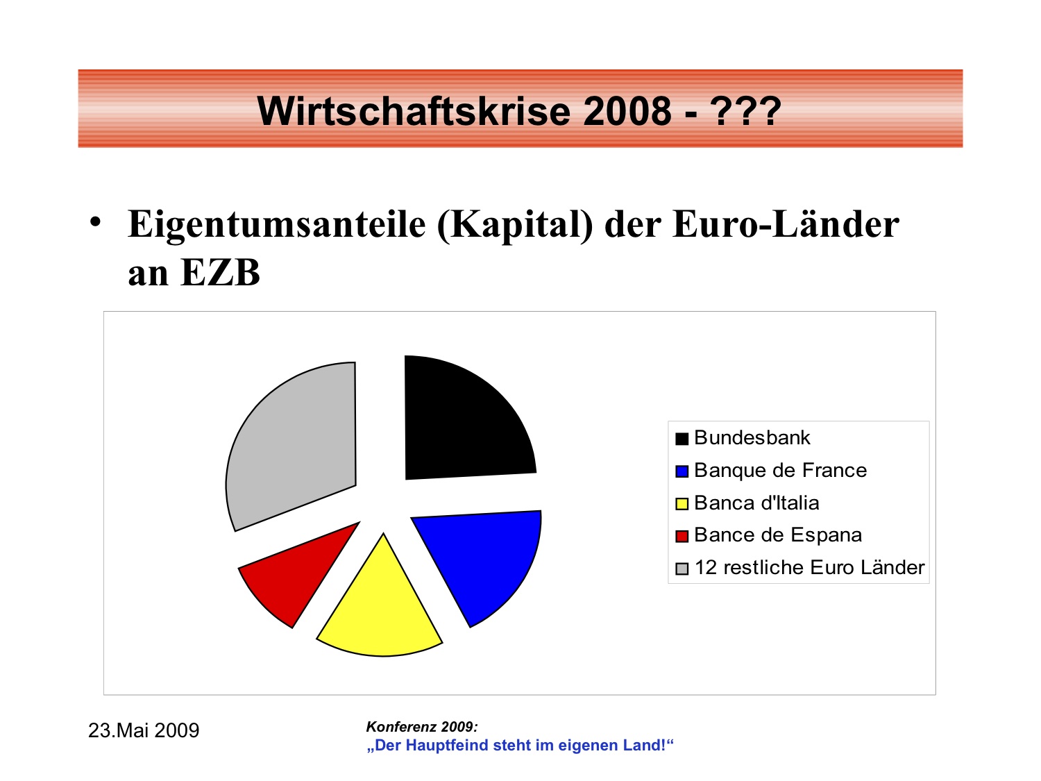 Dieser Kuchen zeigt die Besitzanteile an der Europäischen Zentralbank. Es ist nicht so, dass die Euro-Länder irgendwie gleichberechtigt wären im Hinblick auf diese Institution. Die weiter existierenden Nationalbanken (wie die Bundesbank) haben jeweils unterschiedlich hohe Eigentumsanteile an der EZB. Das große, schwarze Stück ist die Bundesbank, daneben Banque de France, Banca d’Italia und die anderen 12 Länder, die am EURO beteiligt sind.