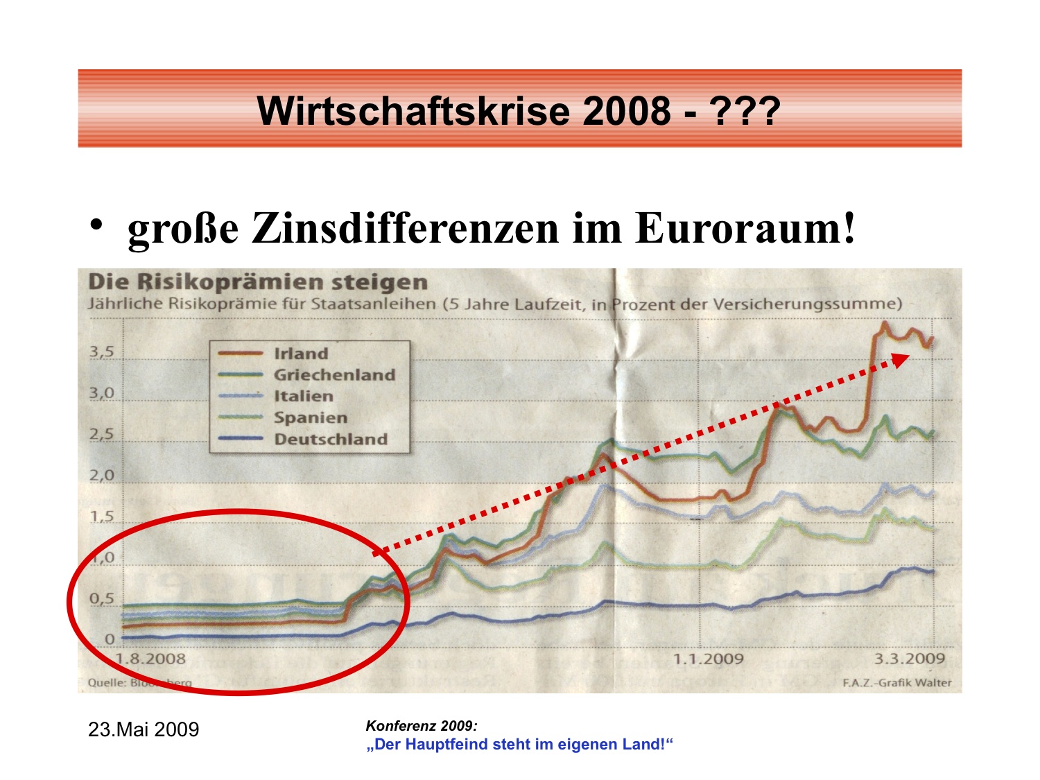 Seit August 2008 haben sich die Zinsen im Euroraum plötzlich stark ausdifferenziert, auf einmal mussten Irland und Griechenland 3,5% pro Jahr mehr bezahlen als Deutschland (wenn sie überhaupt in der Praxis noch Geld kriegten). Und das, obwohl es innerhalb einer Währung eigentlich solche Unterschiede eben nicht gibt und diese vorher nicht existiert haben.