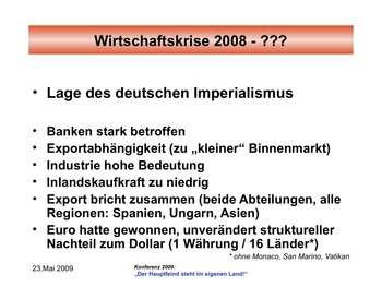 Diese Euro-Thematik zeigt einen strukturellen Nachteil für den deutschen Imperialismus auf: Er hat kein einheitliches Land, keine einheitliche Regierung wie die USA. Er hat mit dem Euro in der Konkurrenz zum Dollar einen Riesenfortschritt gemacht, aber es bleibt mit Nachteilen behaftet.