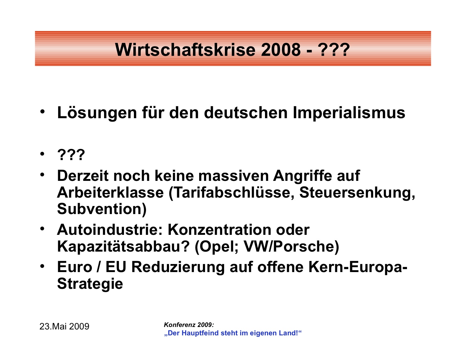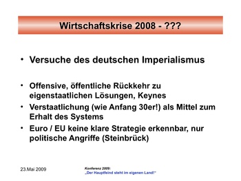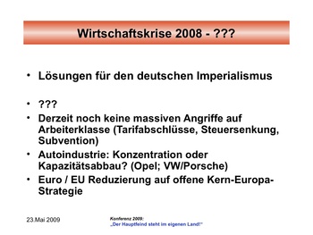 Für uns steht deshalb hier die Frage erneut: Wie und in welche Stoßrichtung die Arbeiterklasse informieren, aufklären und mobilisieren? Wie den Hauptfeind im eigenen Land, den Deutschen Imperialismus, in der Krise angreifen?