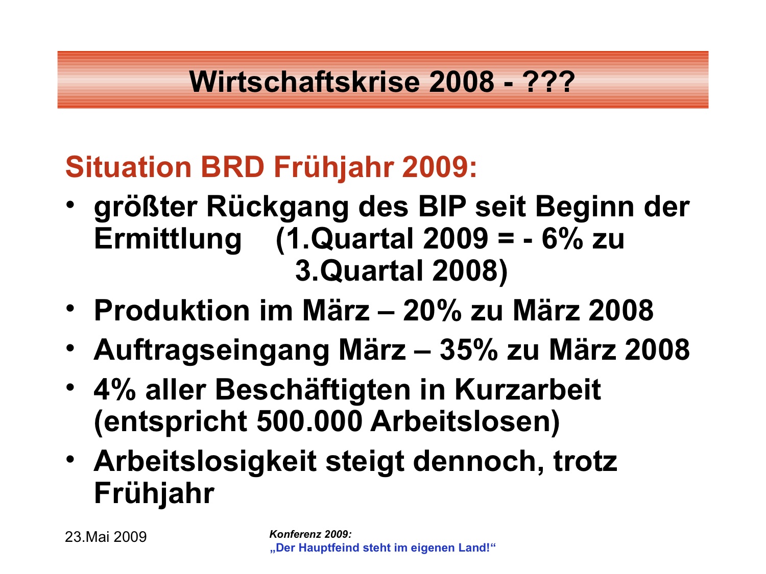 Im Moment gibt es noch keine massiven Angriffe auf die Arbeiterklasse. Also in voller Breite, auf allen Ebenen usw. Die Seite steht noch bevor. Im Moment herrscht der Gedanke, die Arbeiterklasse noch ruhig zu halten, vor. Es gibt sogar ein paar Bonbons für diejenigen, die noch volle Arbeitszeit haben: Kleine Steuersenkung, Subventionen, Abwrackprämie usw. Deshalb: Die massiven Angriff haben noch nicht begonnen.
