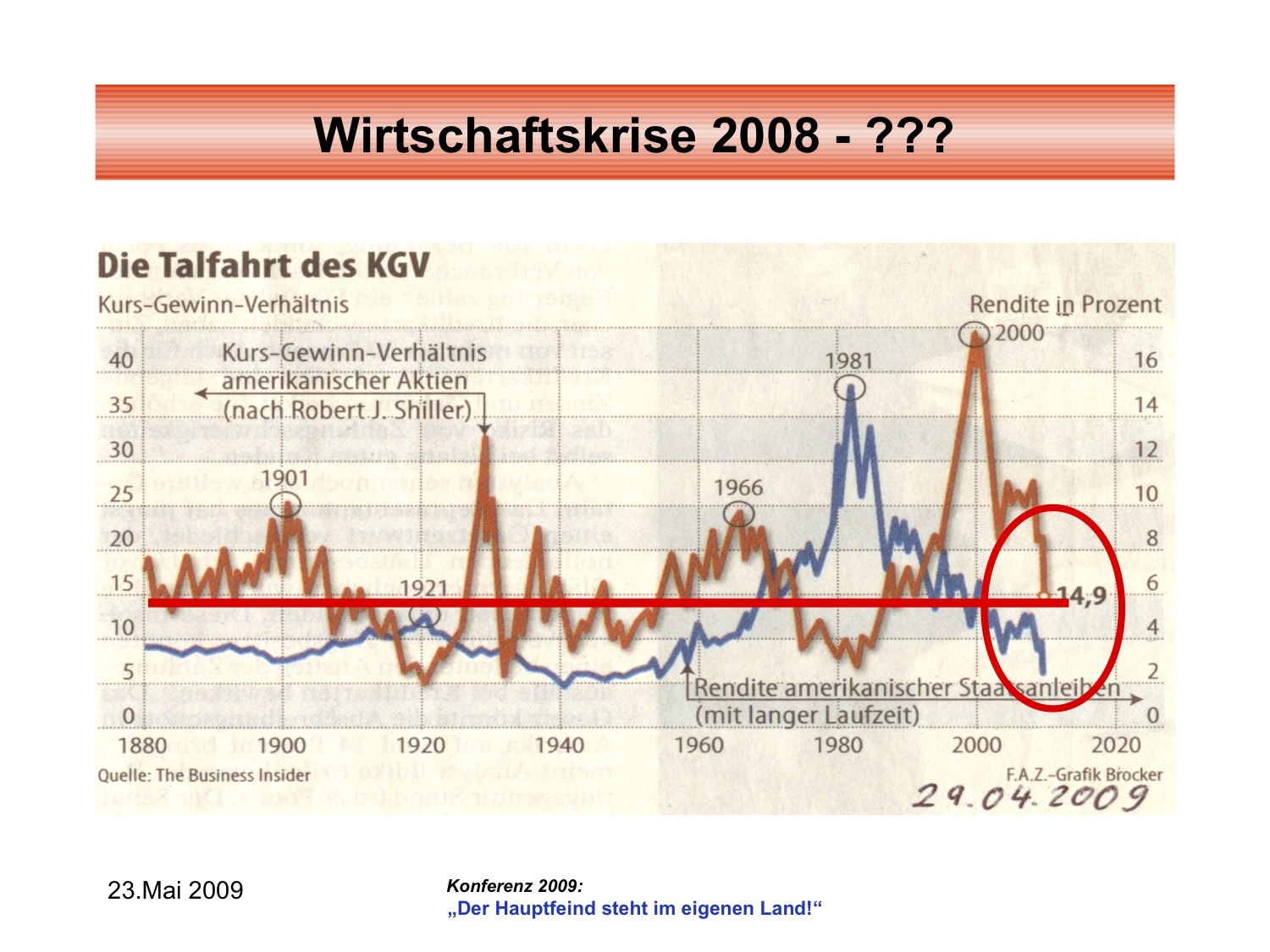 Wenn jetzt das Kursgewinnverhältnis sehr stark ansteigt, wie zum Beispiel im Jahr 2000, in dieser Entwicklung der »New Economy«, bedeutet das, dass die Erwartung der Gewinne extrem steigt, die Aktienkurse im Vergleich zum Durchschnitt höher sind. Wir haben jetzt die Situation, da ist noch ein sozusagen relativ normaler Wert. Das ist die Aussage. Das heißt, die Börsenkurse sind jetzt noch nicht völlig abgestürzt, obwohl sie hier im Vergleich zu 1929 schon niedriger waren, das heißt da kann einiges durchaus noch nach unten gehen. Die Erwartung ist eigentlich immer noch, dass sich das relativ bald wieder erlösen wird für das Kapital. Die Börsenkurse sind noch nicht total am Boden angekommen. Auch das wieder als Hinweis: wir sind halt in einer scheinbaren Phase eine gewisse Beruhigung. Es kann sich recht bald oder wird sich dann auch weiterentwickeln. Wir müssen es einschränken, in welcher Phase sind wir jetzt möglicherweise? Wir sind in einer Krise, die bisher etwas mehr als ein halbes Jahr dauert – aller Wahrscheinlichkeit nach noch ziemlich am Anfang.