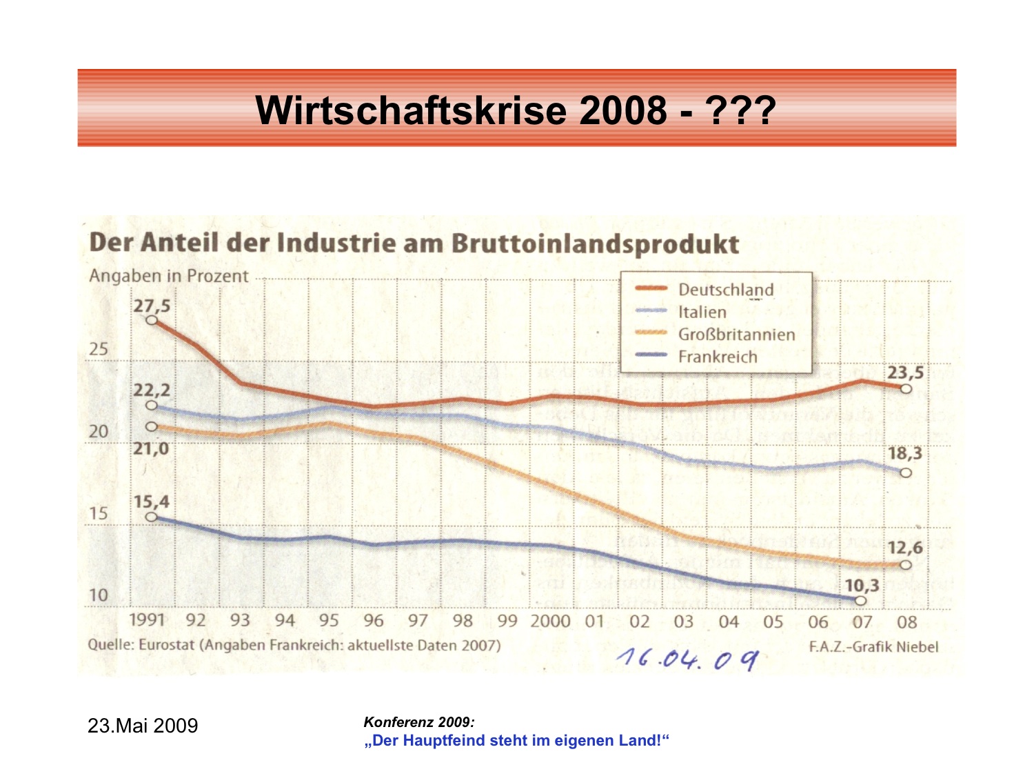 Also die Industrie hat wesentliche Bedeutung, und das ist auch für die aktuelle Situation, für die Krisenanalyse wichtig, dass nämlich der deutsche Imperialismus teils sogar größere Probleme damit hat, weil er nach wie vor einen so starken Industrieproduktionsanteil hat.