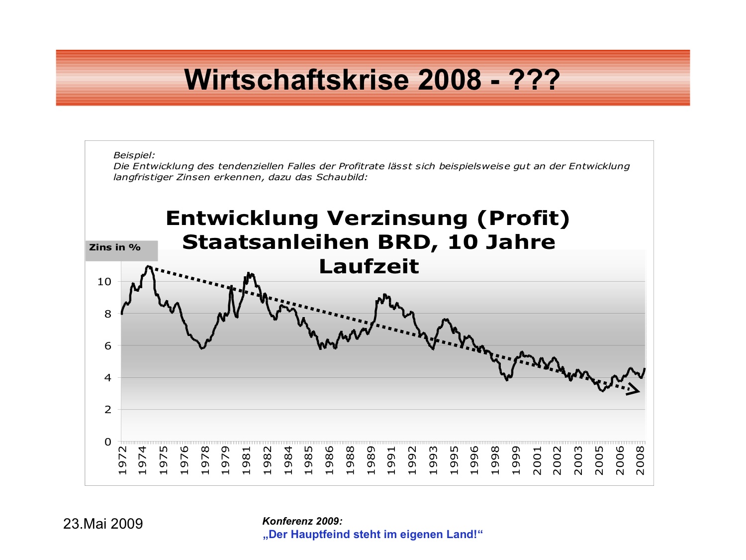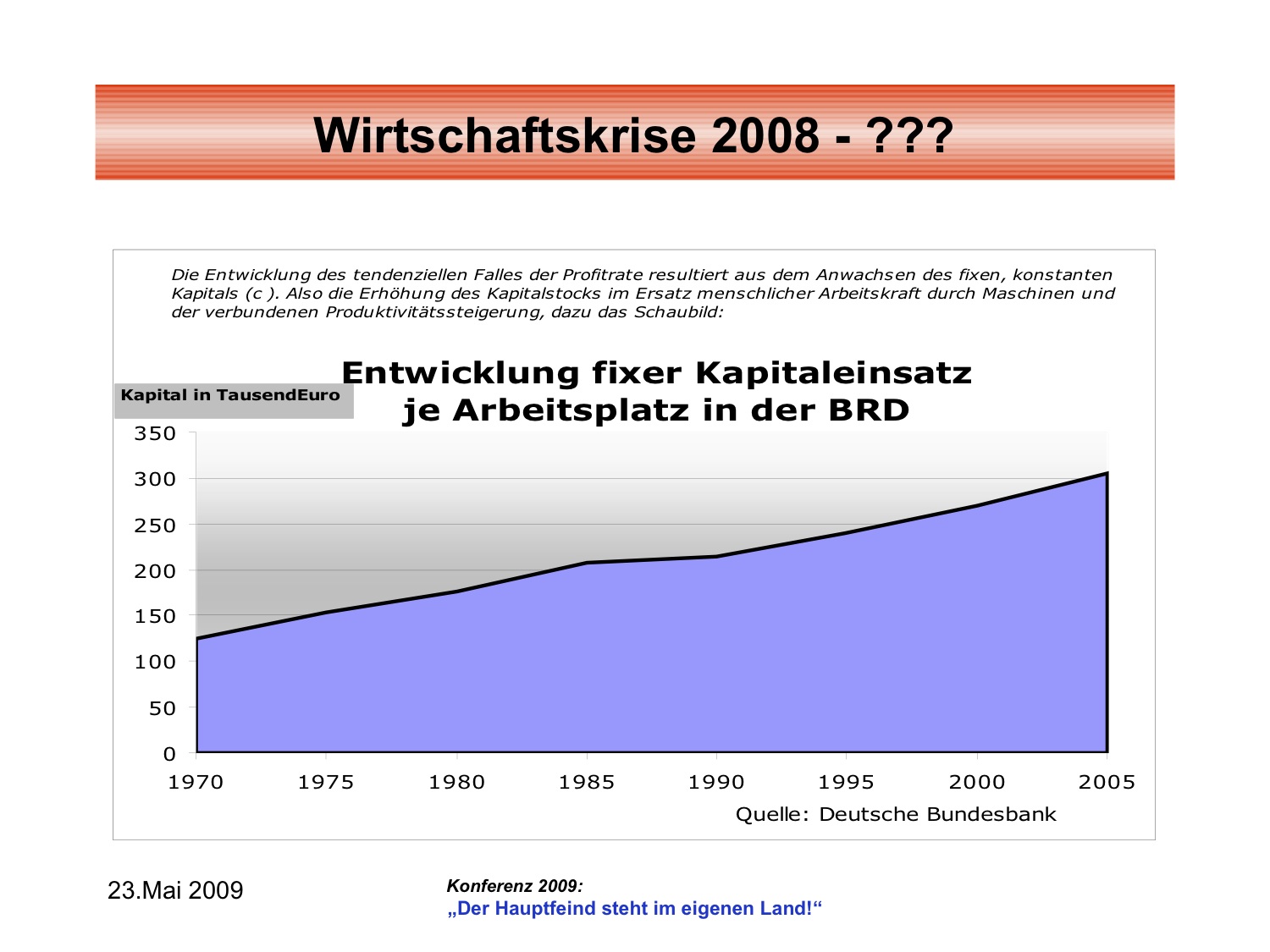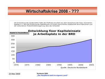 Wie kommt eine solche Krise nun zu Stande? Wo liegen die eigentlichen Ursachen? Hier ist abgebildet, wovon ich vorhin schon sprach, der Anstieg des konstanten, fixen Kapitals. Insbesondere also der Wertbetrag des Maschineneinsatzes je Arbeitsplatz (nach der Statistik der Bundesbank). Erkennbar ist die Entwicklung von 1970 mit 150.000 Euro pro Arbeitsplatz bis heute auf über 300.000 Euro je Arbeitsplatz. D.h. pro Arbeitsplatz habe ich 300.000 Euro durchschnittlichen Kapitaleinsatz. Weil es der Durchschnitt ist, ist es in der Industrie noch mal entsprechend höher, in der Stahlindustrie ist das zum Beispiel ganz extrem an bestimmten Arbeitsplätzen, verglichen mit Sozialarbeitern und Kindergärtnern, obwohl natürlich auch Gebäude mitzurechnen sind. Es zeigt auf jeden Fall, dieser Anstieg ist massiv, und das ist eben in der Wirkung unter kapitalistischen Umständen das Problem. Wenn ich den Arbeitsplatz da habe und damit nichts mehr produziert wird, dann ist dieses Kapital dann irgendwann mal wertlos, vernichtet. Mindestens vorübergehend ist es wertlos, es wirft den Profit nicht ab, der beabsichtigt ist. Diese Thematik verschärft nun die Krise, obwohl vorher mehr effektive Maschinen mehr Profit bedeuteten. Wieder ein krasser Widerspruch: technischer Fortschritt ermöglicht extrem wirtschaftliches und rationelles Produzieren, aber natürlich zu Lasten der Menschen. Und in der Krise wird die effektive Maschine, bzw. der Kredit dafür, zum Klotz am Bein.