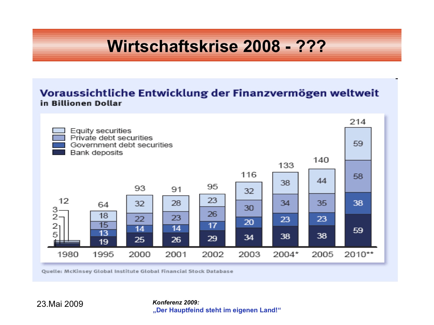 In der Ausgangslage der Überproduktion ist sehr viel Kapital in der Produktion angelegt, und weitere Fabriken machen keinen Sinn. Folglich fließt Kapital in die weitere Anlagesphäre (zum Teil von Anderen auch als »Spekulationssphäre« bezeichnet). Hierzu sehen wir eine Prognose aus einer Studie der großen, weltweit tätigen Beratungsfirma McKinsey von 2008. Die Prognose für 2010 ist natürlich hinfällig. Aber man sieht ganz klar den Anstieg des Finanzvermögens über längere Zeiträume.