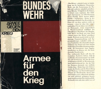 Anlässlich des 10-jährigen Bestehens der Bundeswehr war in Westdeutschland ein Buch »Bundeswehr – Armee gegen den Krieg« erschienen. Dagegen hält schon der Klappentext des Für-Krieg-Buches die frappierende These: »Noch nie wurde in der an Aufrüstung, Expansionsdrang und Aggressionskriegen wahrlich nicht armen Geschichte des deutschen Imperialismus eine Armee mit einer derart eindeutigen Zweckbestimmung aufgestellt, als Instrument eines Aggressionskrieges zu dienen, wie die westdeutsche Bundeswehr.«