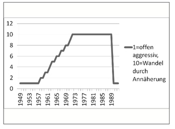 Sehen wir uns nun an, wie der DGB seine von der deutschen Monopolbourgeoisie gestellten Aufgaben gegen DDR und FDGB meisterte. Wir können über die Jahre von 1949 bis 1990 im wesentlichen zwei Vorgehensweisen unterscheiden: die eine ist der offene und mit allen Mitteln geführte Kampf gegen DDR und FDGB (das ist die damals sehr erfolgreiche UGO-Methode), die andere entspricht der von Egon Bahr (SPD) 1963 kreierten Politik namens »Wandel durch Annäherung«. Beide Linien hatten das gleiche Ziel, aber verschiedene Methoden. In dem Schaubild sehen wir anfangs den offenen Kampf (UGO-Politik), in der zweiten Hälfte der Fünfziger Jahre beginnt eine Auseinandersetzung im DGB über eine Änderung dieser Politik – diese Debatte hängt mit einer Verschärfung der Konfrontation der imperialistischen Länder gegen die sozialistischen zusammen. Ab 1963 wird der »Wandel durch Annäherung« zu einer offiziellen Methode der SPD, was natürlich die Debatte nochmals beflügelt, und ab 1969 – die SPD ist zusammen mit der FDP an der Regierung – kann der DGB im Fahrwasser der »neuen Ostpolitik« sein Glück versuchen, den FDGB zu Tode zu umarmen. Er traut sich das allerdings erst so richtig ab 1972. 1990 dann werden die Bemühungen durch einen überraschenden Erfolg gekrönt, und der DGB stürzt sozusagen über Nacht ab in die fünfziger Jahre. (Und er ist nicht der einzige. Plötzlich wurde der von allen nicht ganz doofen Menschen belächelte Ausdruck »Zone« wieder salonfähig, der alte plumpe offene Antikommunismus verdrängte die bisherige elegante Unterminierungspolitik, und das auf allen Ebenen der Gesellschaft).