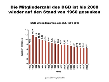 Wie verheerend es sich auswirkte, dass der DGB den FDGB so einfach mal zum Frühstück verspeist hat, zeigt die Grafik der Mitgliederentwicklung des DGB: 1990 kommen so viele aus dem FDGB dazu, und heute sind wir zahlenmäßig unter dem Stand der fünfziger Jahre! (D.h. es ist wesentlich schlimmer als in der Grafik gezeigt, ich hatte nur keine Zeit, sie zu aktualisieren.)
