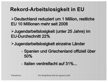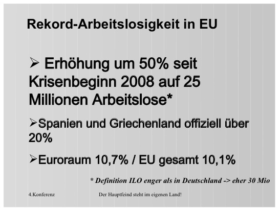 In der restlichen EU (ohne Deutschland) wiederum ist die Zahl der Arbeitslosen um 10 Millionen gestiegen. Besonders gravierend ist dabei die sogenannte Jugendarbeitslosigkeit der unter 25jährigen. Die Jugendarbeitslosigkeit in der EU beträgt 22%, in Spanien und in Griechenland ist die Jugendarbeitslosigkeit ganz offiziell mittlerweile auf über 50% gestiegen, auch in Italien hat sie sich auf 31% verdreifacht. Diese katastrophale Situation ist eben anders als die Situation in Deutschland, was wieder zu dem Punkt gehört: Was heißt das alles für uns und unsere Situation? Die Auswirkungen dieser Krise finden derzeit nicht hierzulande statt und werden voraussichtlich auch weiterhin abgeschwächt sein gegenüber den süd- und südosteuropäischen Ländern, wo wie in Griechenland Menschen sterben, weil sie lebensnotwendige Tabletten nicht mehr erhalten und das Gesundheitssystem zusammenbricht.
