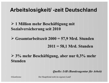 Im Ergebnis sehen wir letztendlich auch einen Anstieg der Gesamtleistung seit 2000 um 11%, bedeutet also eine durchschnittliche Produktivitätssteigerung seit 2000 um 11% je Stunde! Die Arbeiter produzieren heute etwa 11% mehr in gleicher Zeit als noch vor 10 Jahren. Das ist das, was an technischem Fortschritt und weiterer Entwicklung passiert ist. Die Reduzierung der Arbeitslosigkeit ist also nichts weiter als eine Umverteilung der Arbeitszeit. Es ist eine gesellschaftliche Arbeitszeitverkürzung – die wir ja grundsätzlich immer fordern –, aber sie erfolgt wieder einmal ohne Lohnausgleich. Oder anders: Die Reduzierung der Arbeitslosigkeit kommt derzeit in Deutschland mit der Lohnreduzierung zusammen. In der ökonomischen Analyse werden dennoch die alten marxschen Erkenntnisse damit unterstrichen!