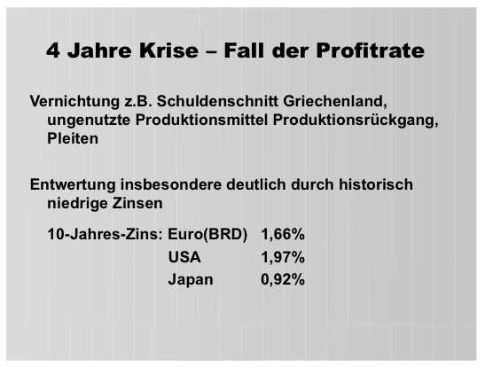 Nehmen wir an, die zu verteilende Gesamt-Profitmasse ist gleich geblieben, aber die Menge an Kapital ist gewachsen, dann verbleibt in dem komplexen Verteilungsprozess der Profitmasse letztlich ein geringerer Teil (hier: geringerer Zins) für das einzelne Kapital, zumindest im Durchschnitt. In der Praxis schwankt die Profitmasse natürlich, geht mal höher und mal niedriger. Aber es ist eindeutig, dass trotz aller Verschärfung der Ausbeutung die Profitmasse weniger (oder langsamer) gewachsen ist als die Menge an Gesamtkapital. Es wird versucht das überschüssige Kapital dennoch zu verwerten wie beispielsweise durch erhöhe Kreditvergabe an Hausbauer (USA) oder an andere Staaten (z.B. Griechenland), und in Formen, die allgemein als Spekulation bezeichnet werden. Letztlich scheitern diese Versuche der Grundfunktion zu entfliehen und es führt zur allgemeinen Kapitalenwertung und -vernichtung.