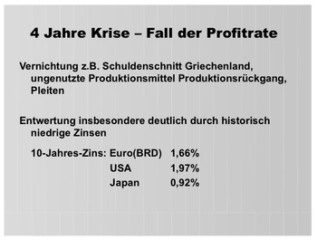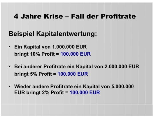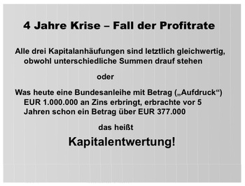 Noch ein letztes Beispiel dazu (Bilder 14/15): Ich habe ein Kapital von 1 Million und es gibt 10% Profit in Form von 10% Zinsen. Dann habe ich 100.000 Euro Profitmasse für mein Kapital erhalten, das Kapital verkörpert einen Anspruch von 10%. Habe ich nun 2 Millionen und es gibt nur noch 5% Verzinsung, dann sind es wieder 100.000 Profitmasse und habe ich 5 Millionen, aber nur noch 2% Zinsen, so habe ich auch wieder 100.000. Das heißt: ob da 1, 2 oder 5 Millionen draufstehen, ist sehr relativ. Eine Bewertung erfolgt nur über die Profitrate, hier in Form der Zinshöhe. Also ist es Entwertung, wenn ich heute für 5 Millionen den gleichen Profitanteil wie für 1 Million vor zum Beispiel 20 Jahren erhalte. Langfristig fallen die Zinsen schon über mehrere Jahrzehnte, dies ist Ausdruck des tendenziellen Falls der Profitrate, also der Kapitalentwertung.