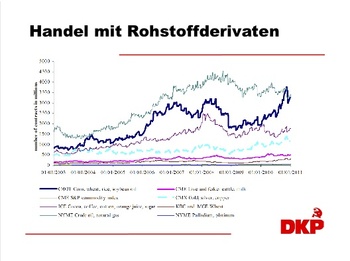 Ein Punkt ist zum Beispiel der folgende. Was ihr hier seht (Bild 16), das sind die Transaktionen mit Rohstoffderivaten. Sprich, an diversen Börsen werden Geschäfte, Verträge mit Rohstoff-Underlying, also sprich Rohstoffpreise, Rohstoffmengen gehandelt. Wie man sehen kann, ist die Zahl der Transaktionen und auch deren Wert über die letzten Jahre gestiegen. Ganz knapp zusammengefasst: Rohstoffpreise steigen. Das ist eine Tatsache, die die deutsche Industrie beunruhigt. Ungefähr seit 2005 gab es Initiativen, als absehbar war, dass es in einigen Bereichen der Rohstoffversorgung knacken könnte. Wie gesagt, am Anfang mache ich es ein bisschen politischer. Die FDP hatte ich gerade schon zitiert. Noch ein kleines Zitat von Herrn Mißfelder, ehemals Junge Union. Er hat bei der Konrad-Adenauer-Stiftung folgendes geschrieben unter der Überschrift »Rohstoffaußenpolitik – Weltordnungspolitik gestalten«. (Allein diese Überschrift ist schon ein Anspruch an den deutschen Imperialismus):