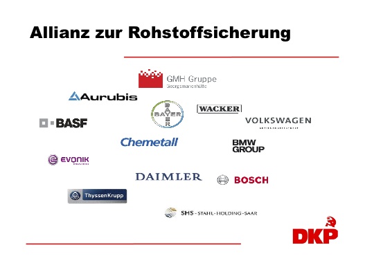 Dieses Jahr wurde die Allianz zur Rohstoffsicherung gegründet (Bilder 17/18). Hier sind ziemlich prominente Namen der deutschen Produktionswirtschaft dabei, insbesondere die ganzen großen aus dem Chemiebereich wie BASF, Evonik oder Bayer. Das sind die, die den größten Teil der deutschen Chemieproduktion ausmachen. Wir haben einige ziemlich große Namen wie Daimler, BMW, Volkswagen aus dem Bereich der Automobilindustrie – wie wir alle wissen, auch einer der bedeutendsten Teile der deutschen Wirtschaft – die sich zusammengetan haben in einer sogenannten Allianz zur Rohstoffsicherung.