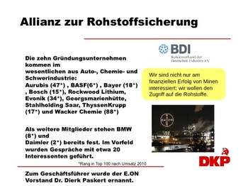 Diese Unternehmen haben sich zusammengetan in einer GmbH mit einem E.on-Vorstand vorne dran, mit folgendem Motto: »Wir sind nicht nur am finanziellen Erfolg von Minen interessiert; wir wollen den Zugriff auf die Rohstoffe«.