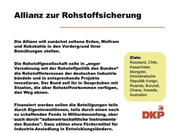 In dieser Allianz für Rohstoffsicherung, die sich jetzt erst einmal konstituiert hat, sollen (über einen Fond oder direkt) Milliarden reingesteckt werden, um dann gemeinsam Rohstoffsicherung weltweit zu betreiben, im Auftrag der Monopole, die ich gerade genannt hatte. Es ist natürlich auch in der Diskussion, Fördermittel durch die KFW und andere staatliche oder halbstaatliche Institutionen in Anspruch zu nehmen. Zur Zeit allerdings gibt es kein direktes finanzielles Engagement der Bundesregierung, bis jetzt handelt es sich finanziell um eine privatwirtschaftliche Initiative.