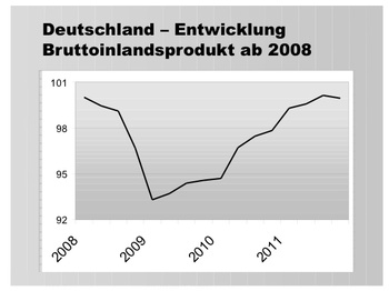 Wir beginnen wieder mal mit der Kurve des Bruttoinlandsproduktes (BIP) bezogen auf Deutschland. Man muss immer dazu sagen, das BIP ist die Zahl, die zur Verfügung steht, um aus bürgerlicher Quelle eine Gesamtentwicklung zu messen. Das zeigt eine Tendenz, entspricht aber nicht der methodischen Entwicklung, die wir verwenden würden, wenn uns große Institute zur Verfügung stünden, die das ermitteln. Also müssen wir uns notgedrungen oder hilfsweise am BIP orientieren.