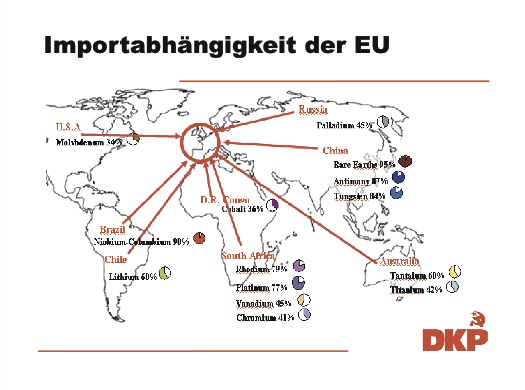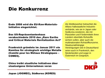 Stattdessen hat Frankreich im Januar 2011 ein eigenes Komitee gegründet, das sich damit beschäftigt, wie für Frankreich die strategische Rohstoffsicherung gemacht werden soll. Wir haben in den USA natürlich auch Initiativen dafür. Wir haben in China, das wissen wir auch, natürlich dieselben Versuche (allerdings unter anderen gesellschaftlichen Bedingungen). Auch in Japan oder Süd-Korea sind zurzeit ähnliche Versuche zu beobachten. Spannend ist für uns innerhalb der EU, wie die Zusammenarbeit und Konkurrenz in der EU und die Konkurrenz direkt über die staatlichen Institutionen ausgetragen wird.
