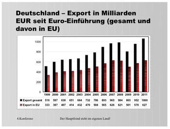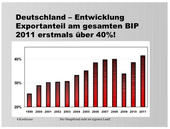 Es ist immer zu beachten, dass die ökonomische Entwicklung in Deutschland entscheidend bestimmt und getragen wird von der Exportentwicklung. Dies ist verstärkt seit der Euroeinführung, wie Bild 2 deutlich zeigt. Der Exportanteil an dem beschriebenen BIP ist im Jahr 2011 erstmals über 40% gestiegen, d.h. über 40% dessen, was in Deutschland produziert wird und als Gesamtwirtschaftsleistung entsteht, wird exportiert. Export ist die treibende Kraft für die gesamte Entwicklung, der Export ist in Deutschland seit Euroeinführung von rd. 25% auf über 40% gestiegen.