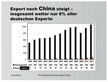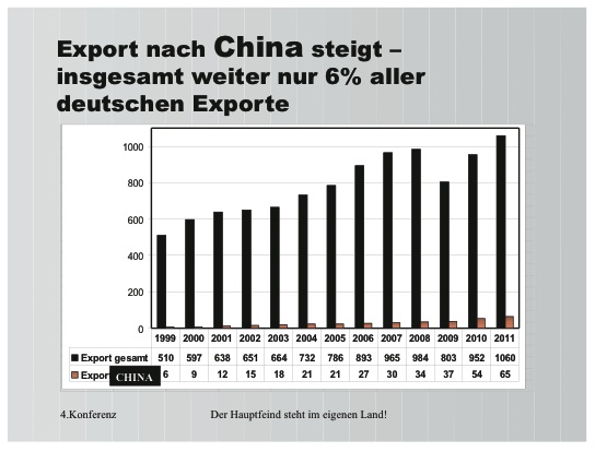Der Export nach China hat eine klar steigende Tendenz, aber es ist unrealistisch, wenn man meint, dass jetzt der rückläufige Export in der EU durch Exporte nach China ausgeglichen wird. Dazu ist der Anteil Chinas immer noch recht gering. Im Übrigen ist der Anteil, der aus China nach Deutschland importiert wird, in einer ähnlichen Größenordnung. Die ganze Diskussion und hiesige Darstellung der Entwicklung der Ökonomie Chinas ist somit etwas überhöht. Sie hat eher eine gewisse Funktion, uns die große Dynamik Chinas um die Ohren zu hauen und sehr viele Ängste zu schüren.