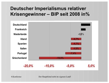 Man kann also zusammenfassen: Das Bruttoinlandsprodukt und der Export sind in Deutschland weiterhin auf hohem Niveau. Die Beschäftigung steigt, allerdings nur durch einen Teilzeiteffekt. Der Träger der Entwicklung ist wieder der Export, der Inlandskonsum ist weiterhin rückläufig oder stagniert. Bezogen auf die Euro- oder EU-Zone fällt die Entwicklung deutlich, ja drastisch anders aus. Das heißt, im Moment ist der deutsche Imperialismus, das deutsche Kapital, nach wie vor Krisengewinner und innerhalb der Krise sehen wir deutlich, verschärft sich die Ungleichheit zwischen den einzelnen Teilen der EU oder des Euro-Raums, einige Länder bewegen sich in Richtung Kolonie-ähnlicher Verhältnisse. Das heißt, die großen, stärkeren Länder, wie insbesondere Deutschland und in geringerem Umfang Frankreich, gewinnen relativ noch dazu und die Lasten werden hauptsächlich auf die Schuldnerländer in Südeuropa abgewälzt.
