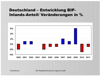 Wie ist im Vergleich zu der nochmals gewachsenen Exportquote die Entwicklung im Inland, bzw. beim Inlandskonsum? Das mehr als jeder andere typische Exportland Deutschland hat beim Inlandskonsum die gleiche Tendenz wie seit vielen Jahren, stagnierend bis rückläufig. Im letzten Jahr ging die Wirtschaftsleistung bezogen auf das Inland erneut um ungefähr 1% zurück (Bild 6). In der Entwicklung seit Euro-Einführung gibt es nur ein Jahr, was in dieser Tendenz ausbricht, nämlich das Jahr 2009, als sehr viele staatliche Konjunktur-Programme und Anreize gemacht worden sind. Seitdem diese ausgelaufen sind, ist die Entwicklung wie vorher. In der Summe der letzten 10-11 Jahre stagniert der Inlandskonsum, real ist er in den letzten 2 Jahren rückläufig.