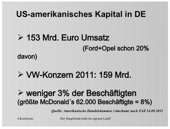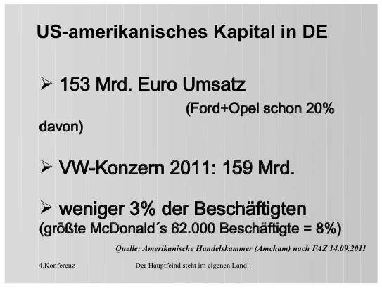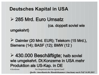 Das deutsche Kapital in den USA macht also doppelt soviel Umsatz mit halb so vielen Beschäftigten. Das liegt daran, dass die Ableger deutscher Konzerne stärker in der Produktion verankert sind, und hier entsteht pro Arbeiter oder Zeiteinheit eine höhere Wirtschaftsleistung als beim Handel oder dem reinen Verkauf zum Beispiel von Hamburgern. Soviel zu der Dimension, die man aufzeigen kann, wenn man jemand begegnet, der sagt, die amerikanischen Konzerne herrschen überall und haben in Deutschland sehr viel Einfluss.