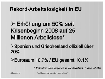 Die drastischen Unterschiede in der wirtschaftlichen Entwicklung in Deutschland gegenüber den anderen Euro-/EU-Ländern wirken sich in Form einer Rekordarbeitslosigkeit massiv auf die Lage der Arbeiterklasse aus (Bild 9). Innerhalb der EU ist die Arbeitslosigkeit seit Krisenbeginn etwa um 50% erhöht, man spricht momentan insgesamt von 25 Millionen Arbeitslosen. Bei dieser Zahl gibt es eine Definition von der ILU, die etwas enger gefasst ist als in Deutschland. Das heißt, da werden noch nicht mal alle mitgerechnet, die derzeit nach der deutschen Statistik als Arbeitslose gezählt würden. Dies bedeutet, dass man mittlerweile realistisch eher von etwa 30 Millionen Arbeitslosen in der EU ausgehen muss. Hier sind Spanien und Griechenland an der Spitze mit einer offiziellen Arbeitslosenquote von rund 20%. Insgesamt haben die Länder des Euroraumes eine durchschnittliche Arbeitslosigkeit von 10,7% und alle EU-Länder zusammen insgesamt 10,1%. Auch hier lässt sich somit nicht erkennen, dass die Einführung des Euro den Menschen wirtschaftliche Vorteile gebracht hätte.