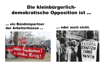 Aus dem bis hier Ausgeführten ergibt sich: Das demokratische Kleinbürgertum ist ein wichtiger Bündnispartner für den demokratisch-antifaschistischen Kampf, und dieser Kampf ist wichtig, um die Arbeiterklasse an die Revolution heranzuführen. Sobald es sich aber um weitergehende Fragen handelt – die Frage der Entwicklung der Produktivkräfte, des Krieges, der Revolution – finden wir beim Kleinbürgertum mehr Friedensillusionen und sonstige kleinbürgerlich-idyllische, vorkapitalistische Anschauungen, als Hilfe im Kampf.