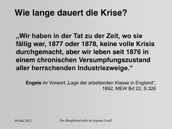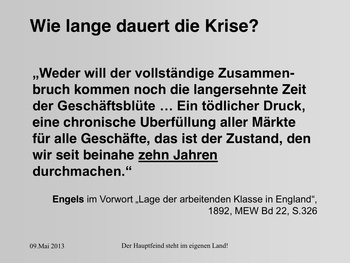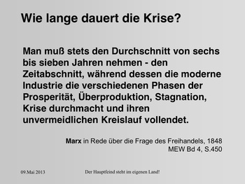 Wir reden immer von Krise, manche reden davon, sie sei vorbei. Ich habe mal ein bisschen geschaut in den Klassikern: Wie lang dauert denn eigentlich so eine Krise? In den frühen Schriften ist das oft als Krisenzyklus beschrieben. Marx 1848 (MEW, Bd.4, S.450):