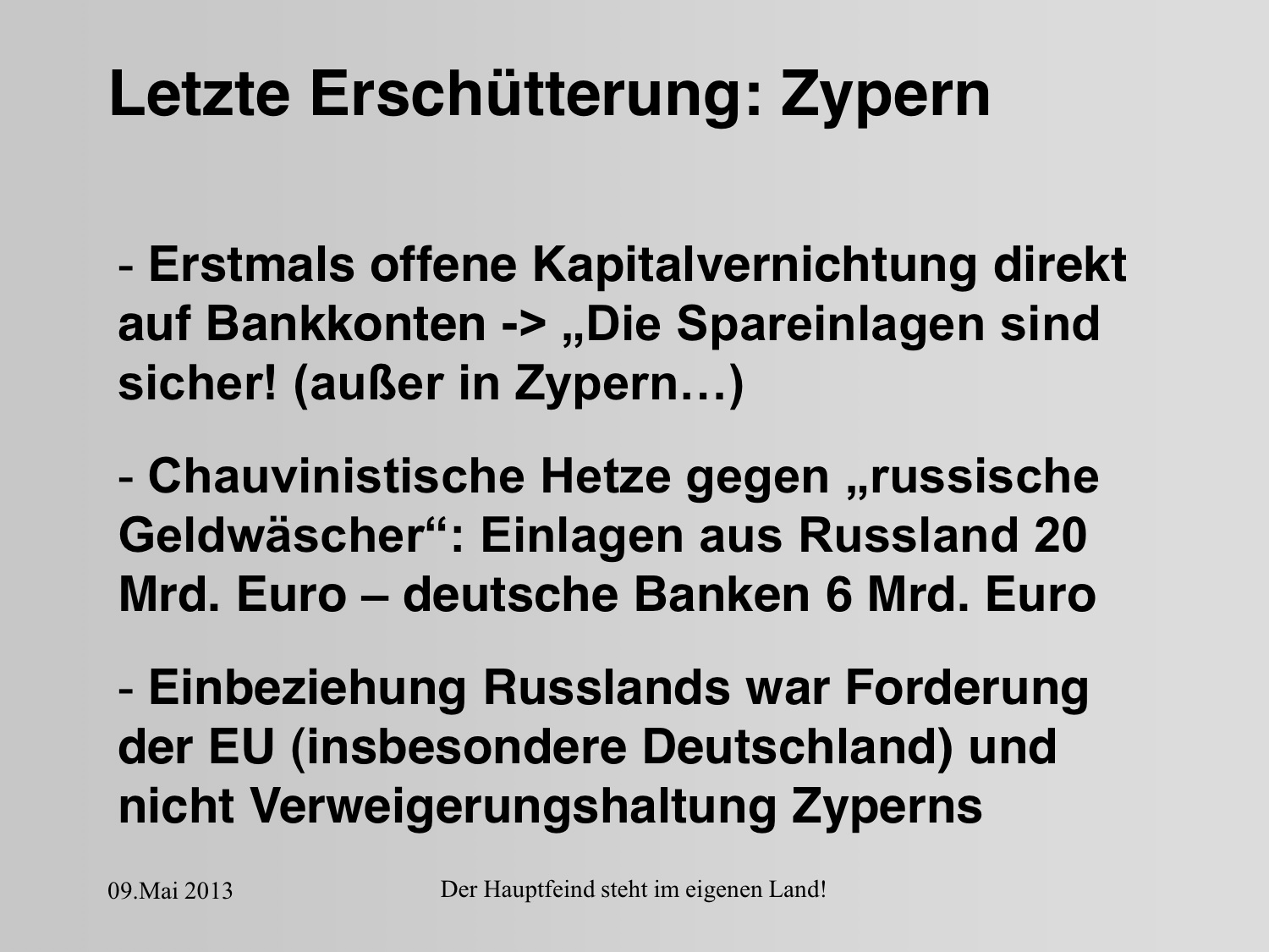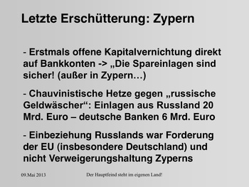 Das ganze wurde mal wieder, wie bei Griechenland, verbunden mit massiver chauvinistischer Hetze gegen die russischen Oligarchen und Geldwäscher. Dagegen hat sich übrigens in einem bemerkenswerten Interview der zyprische Außenminister, also ein ganz normaler bürgerlicher Politiker, gewehrt. Er hat gesagt, wir seien mit dieser Beschreibung massiv geschädigt und beleidigt worden, gerade aus Deutschland, Zypern wäre die Geldwäschestation Russlands.