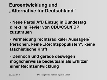 Die AfD hat ihr Programm auch in der Form, dass sie gegen den Euro ist. Aber sie kommt anders daher und hat eine andere Zusammensetzung. Denn sie setzt sich zusammen zum großen Teil aus ehemaligen Leuten der CDU und FDP. Das heißt erst mal nicht viel. Die könnten sich auch eines Tages bei den Faschisten sammeln, aber sie agieren genau in diesem Revier. Sie äußern sich nicht beweisbar rechtsradikal, und sie sind nach meinem Eindruck keine faschistische Kraft.