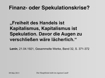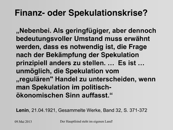 Wir waren schon mal bei dem Punkt: Deutschland als Industrieland. Ein weiterer, sicher auch in der Linken umstrittener Punkt ist die Frage: »Finanz- oder Spekulationskrise?« Auch da habe ich noch mal bei den Klassikern nachgeschaut. Lenin sagt im April 1921 (Werke, Bd. 32, S.371):
