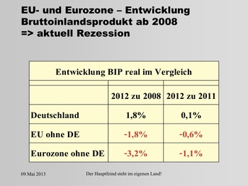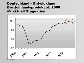 Da wir uns, wie ich darstellen werde, immer noch in der Krise befinden, beginnen wir mit dem Jahr 2008, als die aktuelle Überproduktionskrise massiv begonnen hat. Da haben wir das Jahr 2009 mit dem herbsten Absturz in Deutschland, den es seit dem 2. Weltkrieg gegeben hat, mit einem Rückgang von 7%, und dann die Entwicklung, die abweicht von den anderen europäischen und vor allem Euro-Ländern, das heißt einen Anstieg in Deutschland und aber jetzt aktuell, im letzten Quartal erstmals auch wieder einen Rückgang. Also mittlerweile befindet sich Deutschland in einer Stagnationsphase oder möglicherweise sogar wieder im Übergang zu einer Rezession, einem wirtschaftlichen Abschwung.