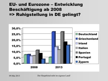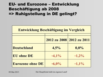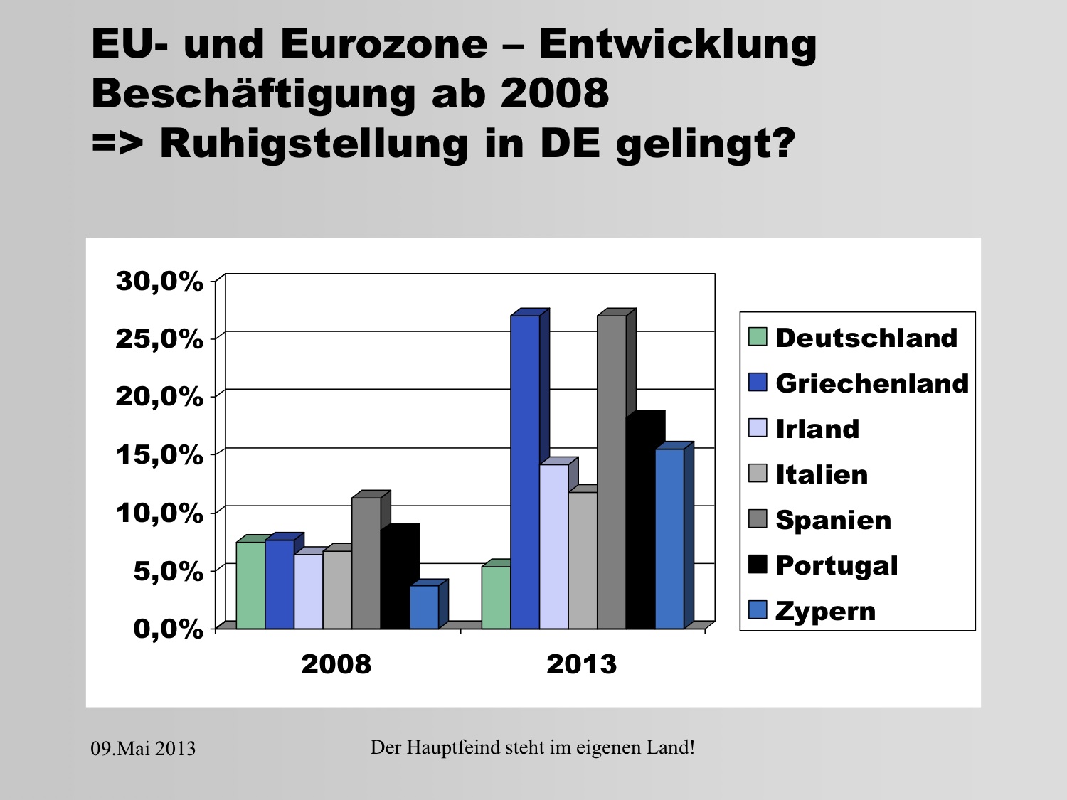 In Summe heißt das in der EU: 4% weniger Beschäftigung oder/und 20 Mio. mehr Arbeitslose seit Beginn, und in der Euro-Zone noch einmal deutlicher: minus 6%, auch im letzten Jahr schon wieder ein Anstieg der Arbeitslosigkeit bzw. Rückgang der Beschäftigung, in Deutschland nur eine Stagnation.