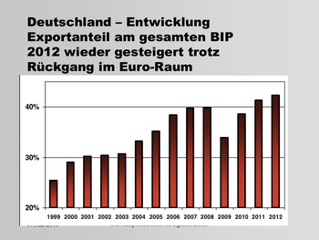Der Exportanteil am BIP ist angestiegen auf 40% bis zur Krise, im Krisenjahr 2009, wo man auch in Deutschland diesen Eindruck einer Krise stärker, eindeutig hatte, und ist 2012 noch mal trotz Stagnation gesteigert worden – im Inland ist es sogar zurückgegangen. Also in Summe wird das ganze weiterhin getragen vom Export. Das hat man schon oft festgestellt, aber warum ist das so? Was verbirgt sich eigentlich hinter diesem Export? Dem bin ich mal nachgegangen.