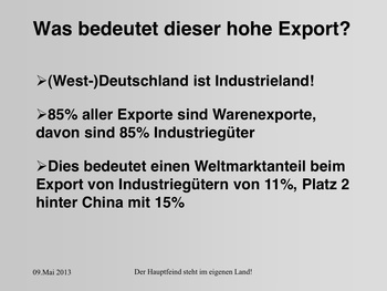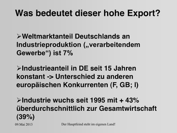 Dieser hohe Export heißt neben allem, was damit politisch zusammenhängt, was wir auch entsprechend kritisieren und angreifen, dass Deutschland weiterhin ein Industrieland ist. Das ist ein Punkt, der in vielen linken Diskussionen ein bisschen unter den Tisch fällt. Das hängt sicher auch damit zusammen, wenn man davon ausgeht, es ist doch nicht mehr so industriell, dann gibt es auch keine Arbeiterklasse mehr und dann stellen sich vielleicht bestimmte Fragen auch wieder ganz anders. Aber gerade dieser hohe Export beweist, dass das hier ein Industrieland ist. Weil nur wenn ich Industriegüter habe, – 85% aller Exporte sind Warenexporte, und 85% davon wiederum Industriegüter – nur dann kann ich so einen hohen Exportanteil haben, der nicht dadurch kommt, dass ich Kartoffeln irgendwohin schicke oder die Bild-Zeitung nach Mallorca geflogen wird – das wäre Dienstleistungsexport.