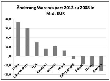 Dem deutschen Imperialismus ist es gelungen, seinen Rückgang bei Exporten in EU-Länder auszugleichen, insbesondere durch Zuwächse in China, dem übrigen Asien, den USA und einigen europäischen nicht-EU-Ländern, darunter Russland. Doch diese Exporte sind schwankender im Absatz, die Position muss stärker abgesichert werden als das Geschäft in den näheren Ländern der EU. Auch wenn China im Vergleich zwischen 2008 und 2013 den größten Zuwachs im deutschen Warenexport ausmacht, stagniert die Entwicklung seit 2011, und weiterhin nur rund 6 % aller Warenexporte aus Deutschland gehen nach China. Die Stagnation dieser China-Exporte resultiert auch daraus, dass zum Beispiel Kfz deutscher Automarken immer mehr in China selbst produziert werden. Diese Fahrzeuge sind damit nicht mehr Teil des Warenexports aus Deutschland, sondern resultieren aus dem Kapitalexport deutscher Automobilmonopole, der Errichtung neuer Produktionsstätten in China.4 Waren- und Kapitalexport werden so zu zwei Seiten einer Medaille.