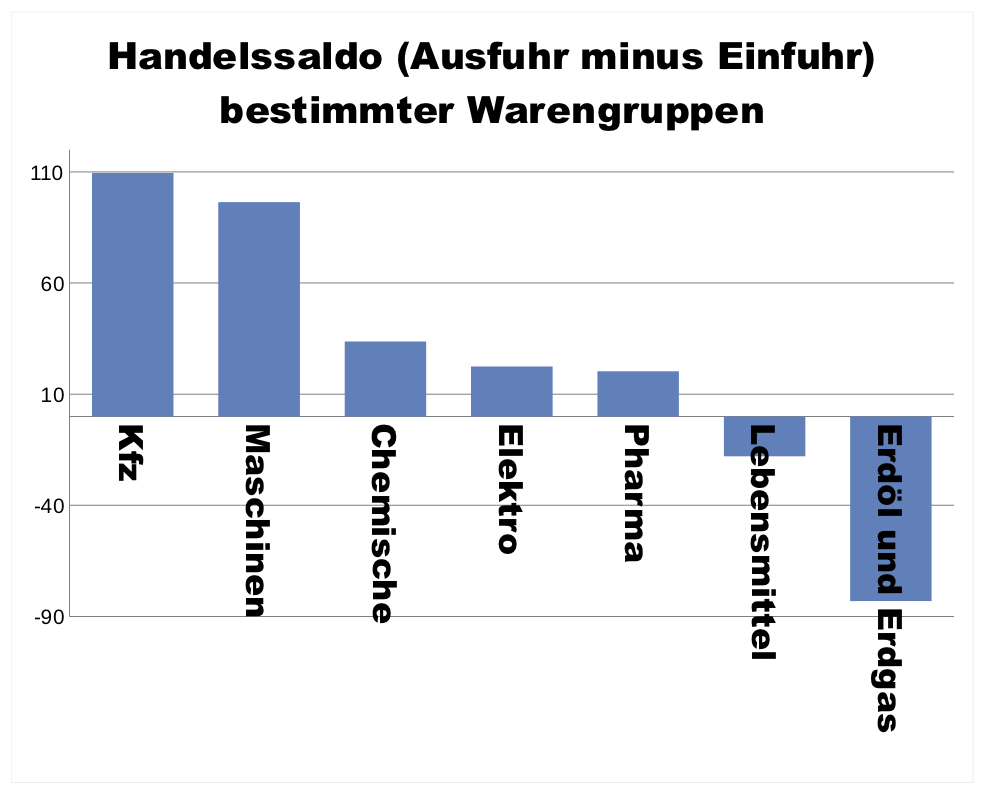 Der Saldo aus Ausfuhr und Einfuhr hinsichtlich einzelner Warengruppen verrät zusätzlich etwas über die Struktur und Stärken des deutschen Imperialismus: