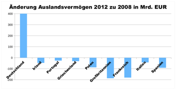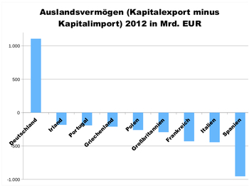 Von den 28 EU-Staaten haben 8 eine positive Bilanz des Auslandsvermögens (Kapitalexport größer als Kapitalimport). Dieser Kapitalexport umfasst dabei sowohl den Kauf von Firmen in anderen Ländern, direkte Investitionen in Produktions- oder sonstige Betriebsstätten, als auch Kapital in Form gewährter Kredite. Von der Summe Kapitalüberschuss der genannten 8 EU-Länder entfällt auf Deutschland allein 63 %, einige der 8 haben nur sehr geringe Überschüsse wie z.B. Malta mit 2 Milliarden Euro. Auf der anderen Seite stehen 20 „verschuldete“ EU-Staaten mit höherem Import von Kapital in ihr Land als in die Gegenrichtung: