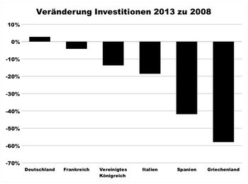 Das Diagramm zeigt die Veränderung der Bruttoanlageinvestitionen in 2013 im Vergleich zu 2008 (Jahr des Krisenausbruches) in Prozent. Bruttoanlageinvestitionen sind alle neuen Maschinen, Gebäude, technische Anlagen usw., die angeschafft werden. Marx definierte diese als konstantes, fixes Kapital. Die allgemeine Tendenz innerhalb des Kapitalismus ist die regelmäßige Erhöhung dieses fixen Kapitals, um immer mehr menschliche Arbeitskraft durch Maschinen zu ersetzen. Dass dies seit Jahren umgekehrt ist, ist ein Beleg dafür, dass die große Krise fortbesteht, insbesondere in den EU-Ländern. Es wird um 15 % weniger investiert als vor fünf Jahren, eine einmalige Entwicklung seit dem 2. Weltkrieg. Dies ist umso bemerkenswerter angesichts der weltweit extrem niedrigen Zinsen.