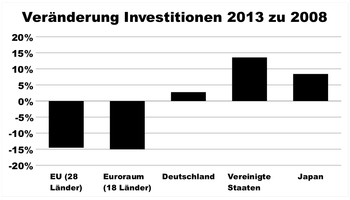Der Vergleich der Gesamtentwicklung in der EU bzw. der Eurozone (diejenigen EU-Länder mit Währung Euro) mit den USA und Japan ergibt ein anderes Bild. Während die Investitionen sowohl in der EU insgesamt als auch bei der Gruppe der Euroländer um 15 % rückläufig sind, liegen diese bei den USA und Japan über den Werten von 2008.